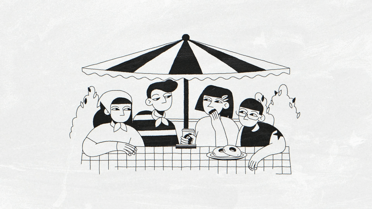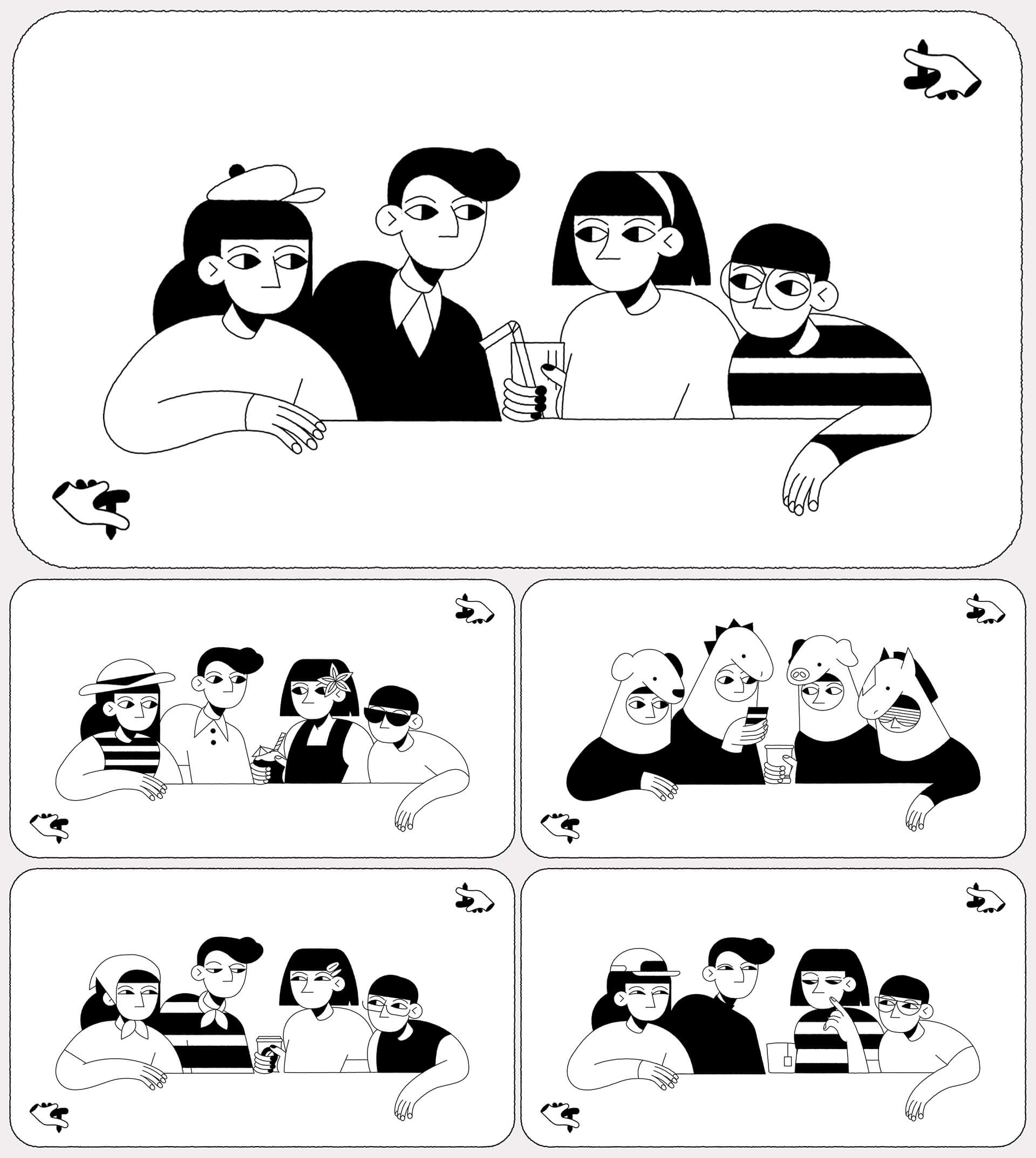 Beyond showcasing the rules and strategic plays through close-ups of the card, we wanted to highlight an essential aspect of he game - it can be played anywhere. Whether at a bar, at home, at a party, in the park, or on vacation. That's why our four characters are always shown in the same arrangement and pose with only their surroundings and outfits changing to reflect different settings.