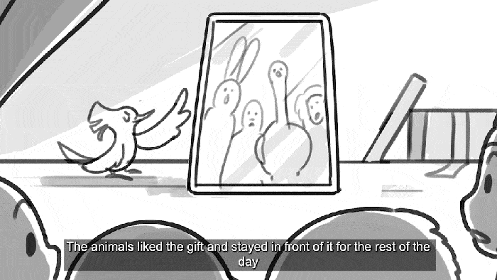 in harmony until a cunning fox and a sly crow give them a mirror that divides them through sparking vanity.