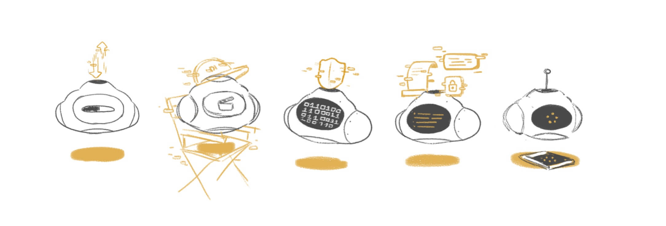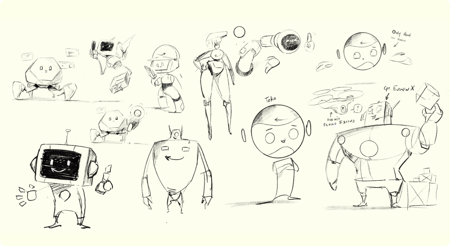 After creating several sketches, we decided on the final design: a flying robot with a screen-like face and a couple of hidden mechanical arms.