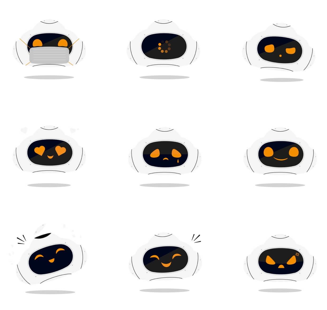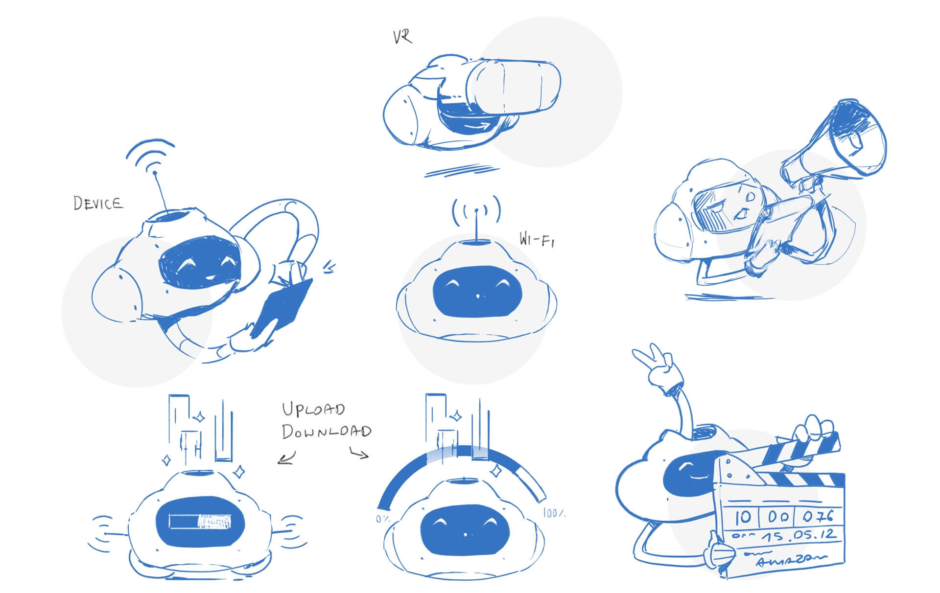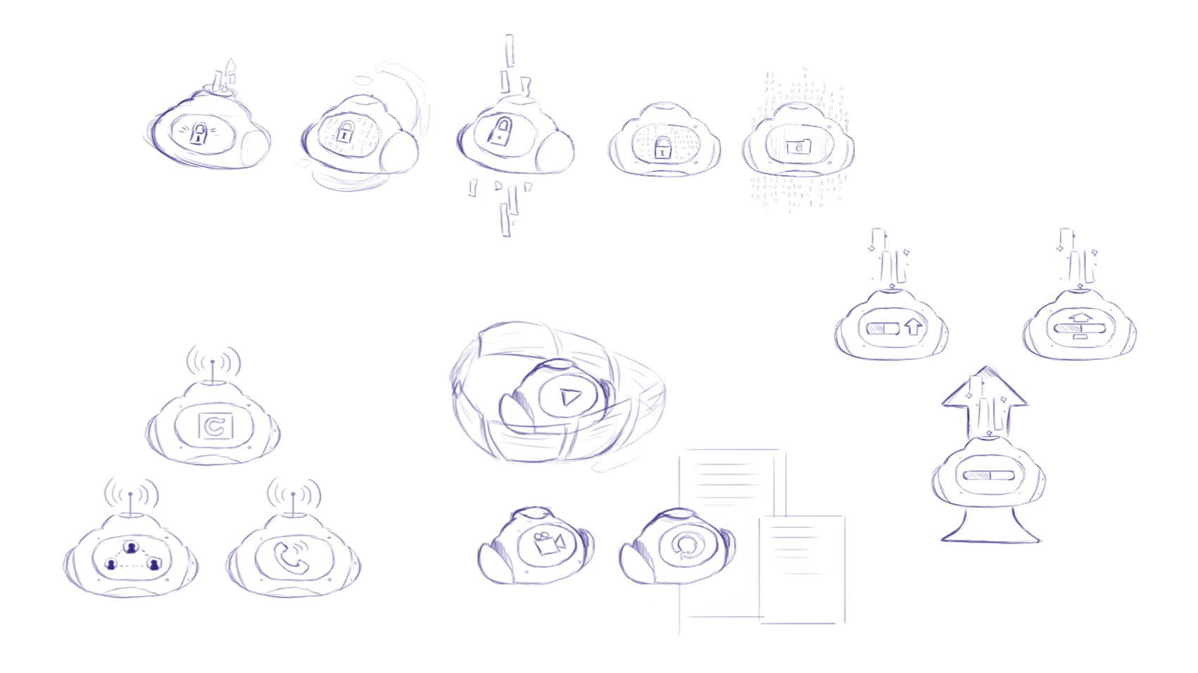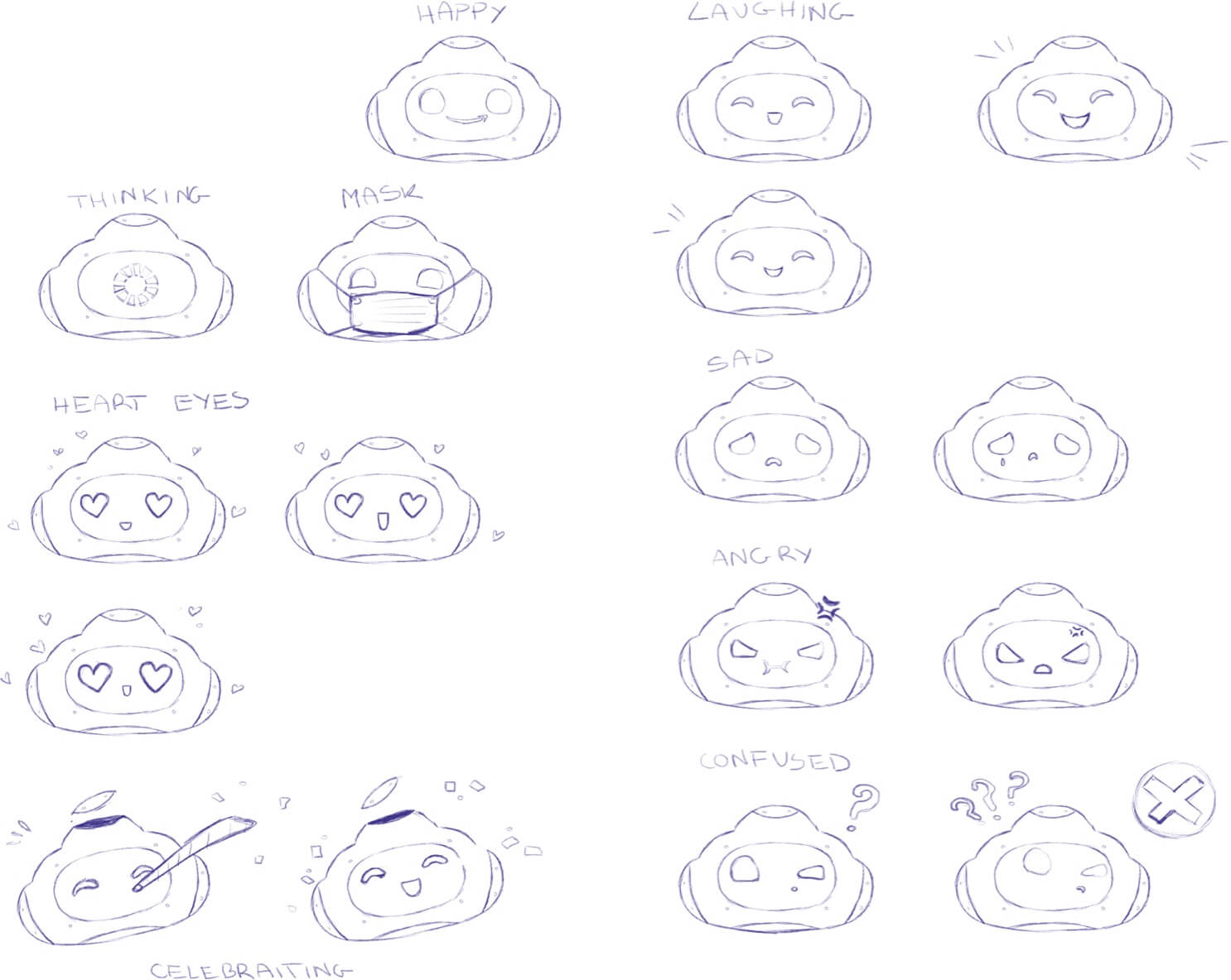 Before moving on to vectorizing the character, we needed to create a series of sketches showing our little robot’s emotions, as well as different poses and behaviors.