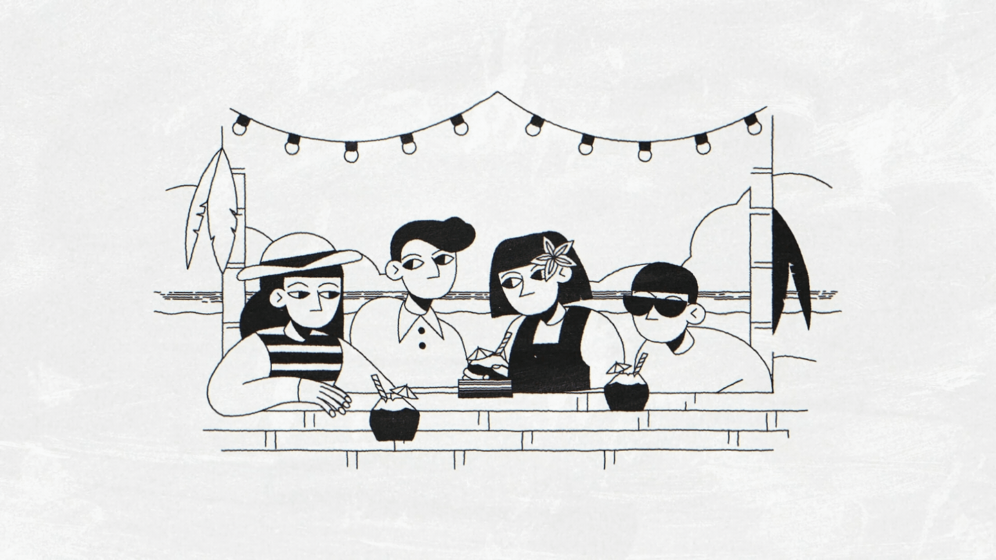 Beyond showcasing the rules and strategic plays through close-ups of the card, we wanted to highlight an essential aspect of he game - it can be played anywhere. Whether at a bar, at home, at a party, in the park, or on vacation. That's why our four characters are always shown in the same arrangement and pose with only their surroundings and outfits changing to reflect different settings.